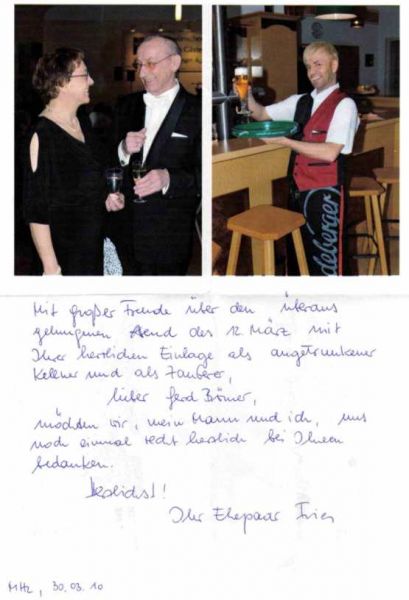 - Hallo Herr Börner, ich möchte mich noch einmal herzlich für Ihr gelungenes Programm (falscher Kellner) bedanken. Alle hatten großen Spaß und die Lachmuskeln wurden bis aufs Äußerste strapaziert. Leider konnte ich Ihnen gar nicht zusehen, sonst hätte ich mich selbst verraten.....;-) Nachdem ich aber Stück für Stück von Jedem erzählt bekomme, was sie "abgezogen" haben, muss ich noch im Nachhinein Tränen lachen. Ein toller Abend - wir werden Sie in guter Erinnerung behalten und Sie weiter empfehlen. Meine Mutter und Schwester schämen sich im Nachhinein für deren Ansagen vor Ihnen. Beide haben Ihnen die Rolle komplett abgekauft. Meine Mutter hat schon lange nicht mehr so viel lachen können und gerade für sie war es mir sehr wichtig. Für Ungehaltenheiten meiner Gäste möchte ich mich entschuldigen. Viele Grüße und ein Dankeschön aus Rossach Saskia Süsser www.saskia-suesser.de