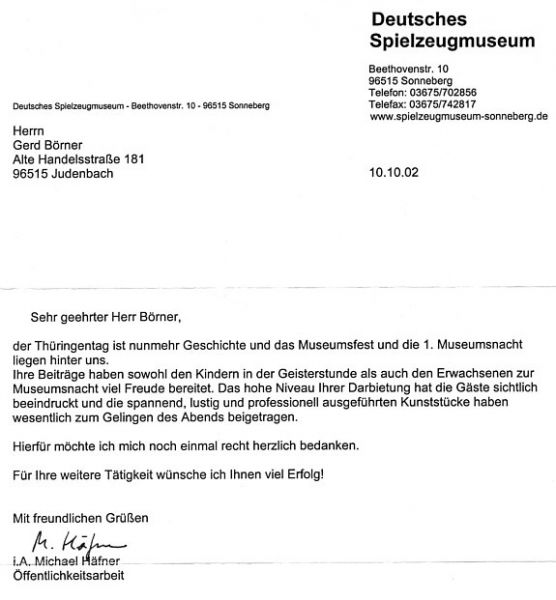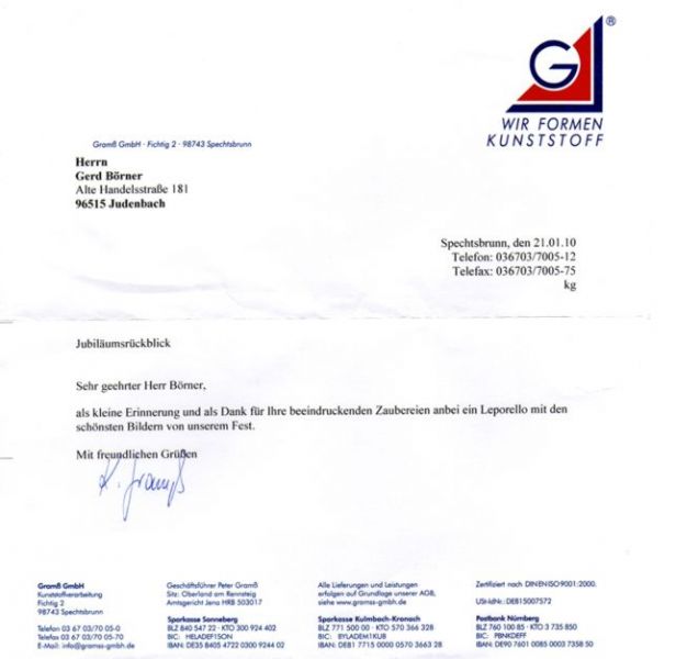 - Lieber Herr Börner, mein Mann und ich bedanken uns nocheinmal sehr herzlich für den amüsanten, einfallsreichen Auftritt, es hat allen Mitarbeitern sehr gut gefallen. Ich wünsche Ihnen weiterhin viel Erfolg. Viele Grüße Gabriela Römer