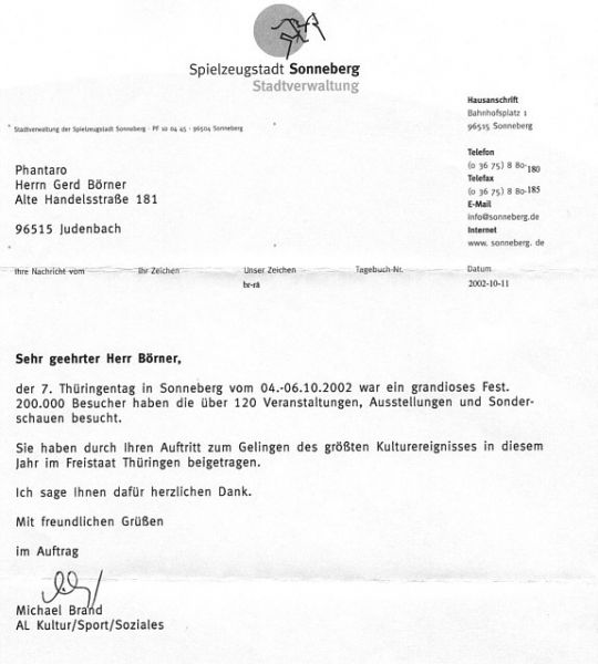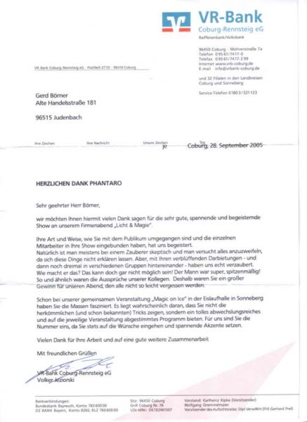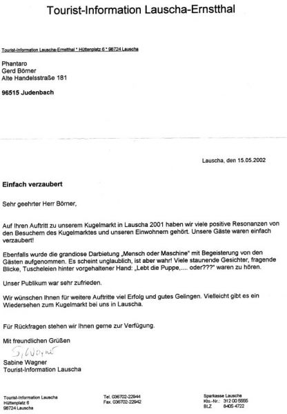 - Großes Lob für die tollen Shows im Jahr 2001. Für 2002 wünschen wir Phantaro viele tolle und zauberhafte Einfälle. Alles Gute! (Event Media Group Germany)